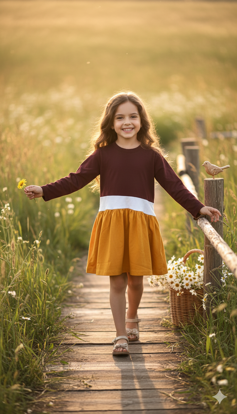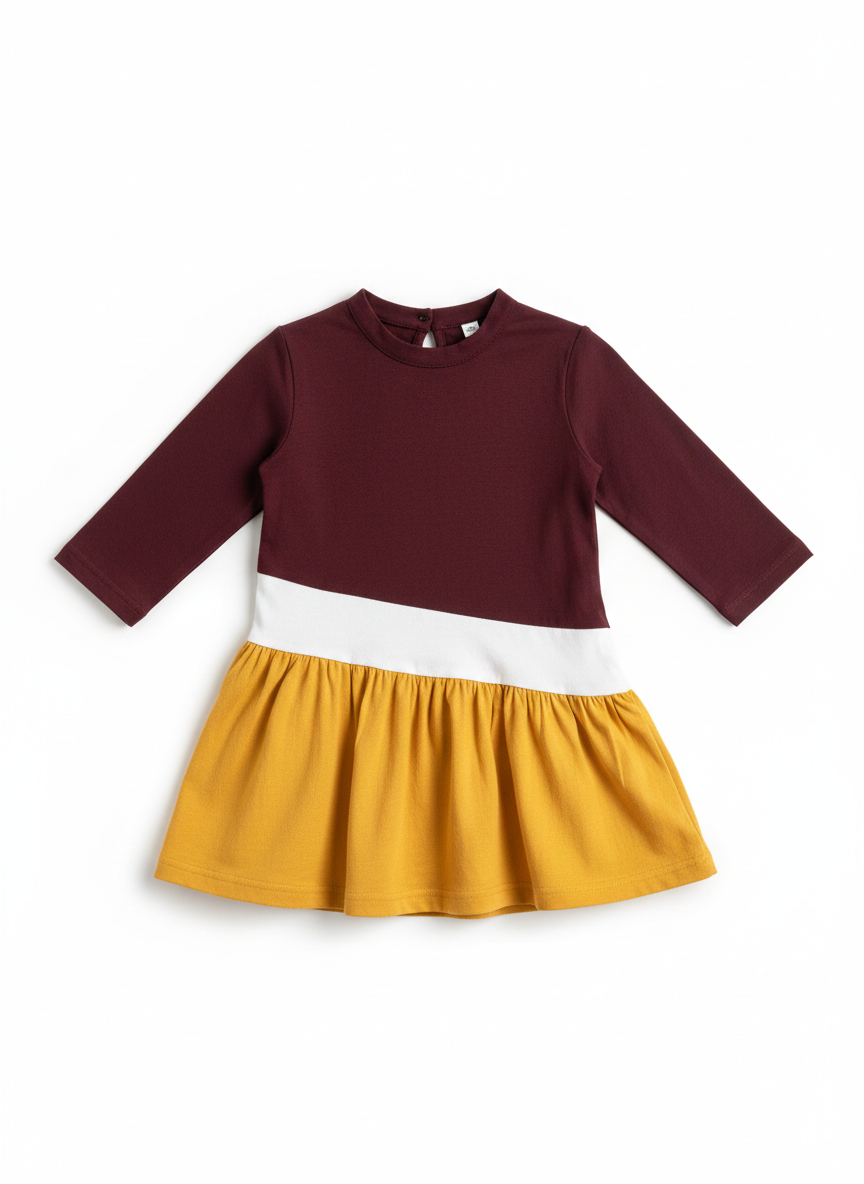 100% cotton jersey dress with long sleeves. A slanted panel adds some fun to the frilly bottom.